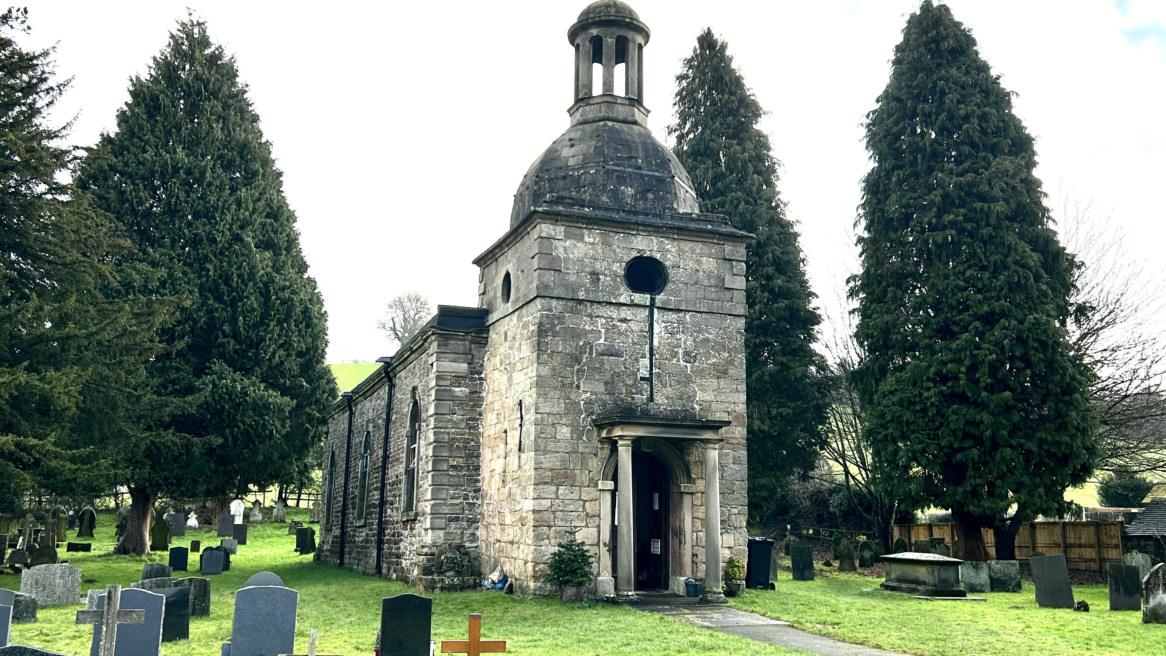 Mappleton faces its Staffordshire neighbour, Okeover, across the flat water-meadows of the Dove. It is an 18th century church, of limestone, small, aisleless and endearingly idiosyncratic with a squat west tower which carries a dome, surmounted by a disproportionately large lantern (this in turn evidently once carried an urn, which now lies damaged at the foot of the tower). The nave is lit on each side by three arched lattice windows, one with tinted glass the rest plain. A 19th century writer dismissed it for its “hideous style that was then considered suitable for ecclesiastical edifices”. The locals disagree: its local nickname is or was “little St Pauls”. Set into the south wall of the nave are three slate headstones of the 18th century, all with their lettering as crisp as ever, one of them (to a Tunnicliff) especially assured, with ambitious scrollwork.