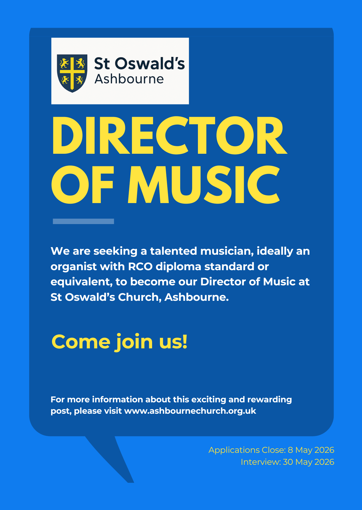 We are seeking a talented musician, ideally an organist with RCO diploma standard or equivalent, to become our Director of Music at St Oswald’s Church, Ashbourne. Someone who is keen to help us develop our already strong music offering by growing our existing choir, developing a Children’s Choir and potentially starting a Community Choir.