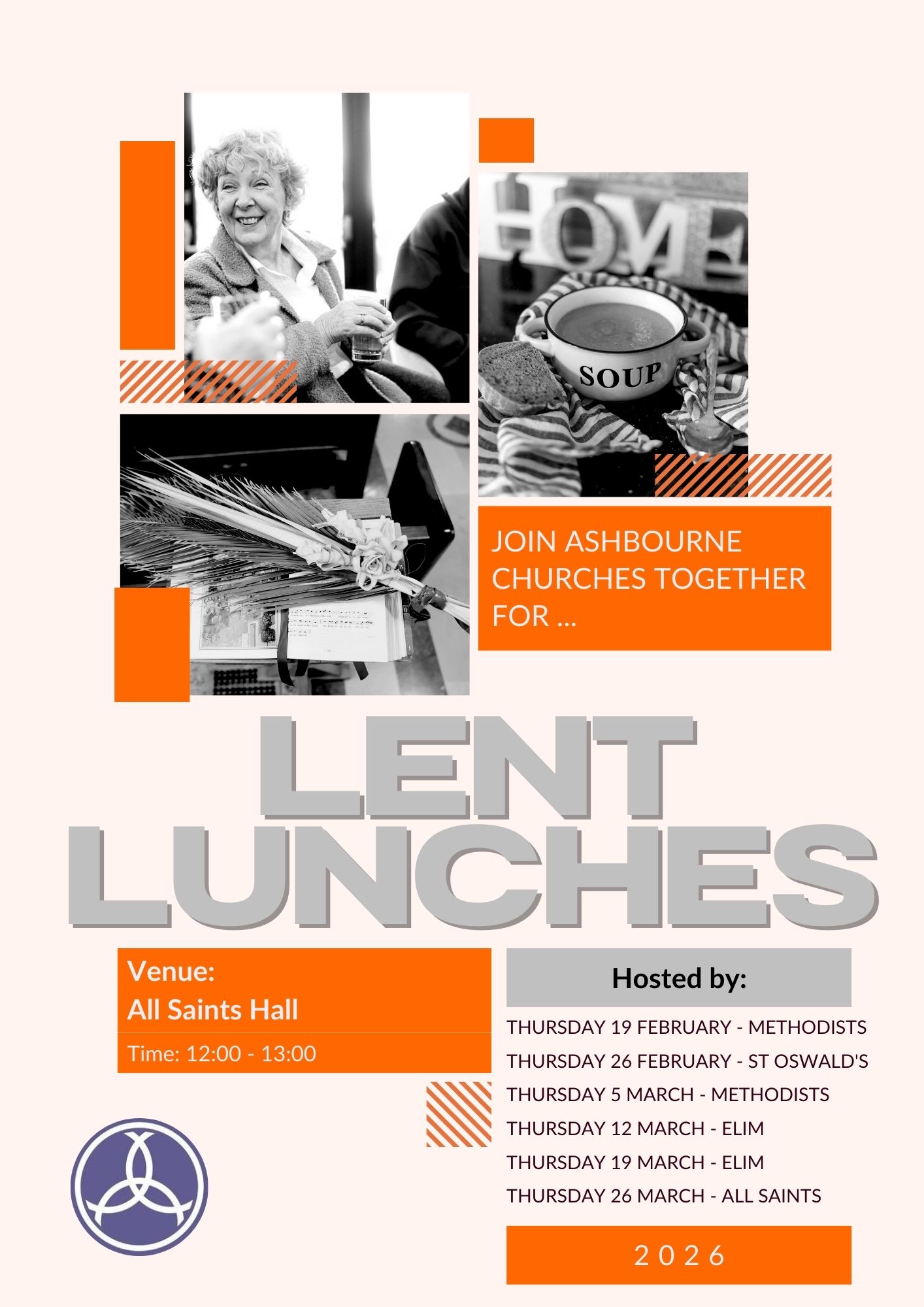 Ashbourne Churches Together will be hosting Lent Lunches at All Saints Hall on Belle Vue Road. St Oswald's will be hosting the lunch on Thursday 26th February from 12:00 noon.